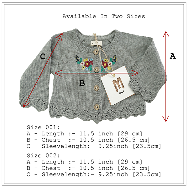Size 002 : length : 8 inches, chest : 9.5 inches, sleeve length : 10inches