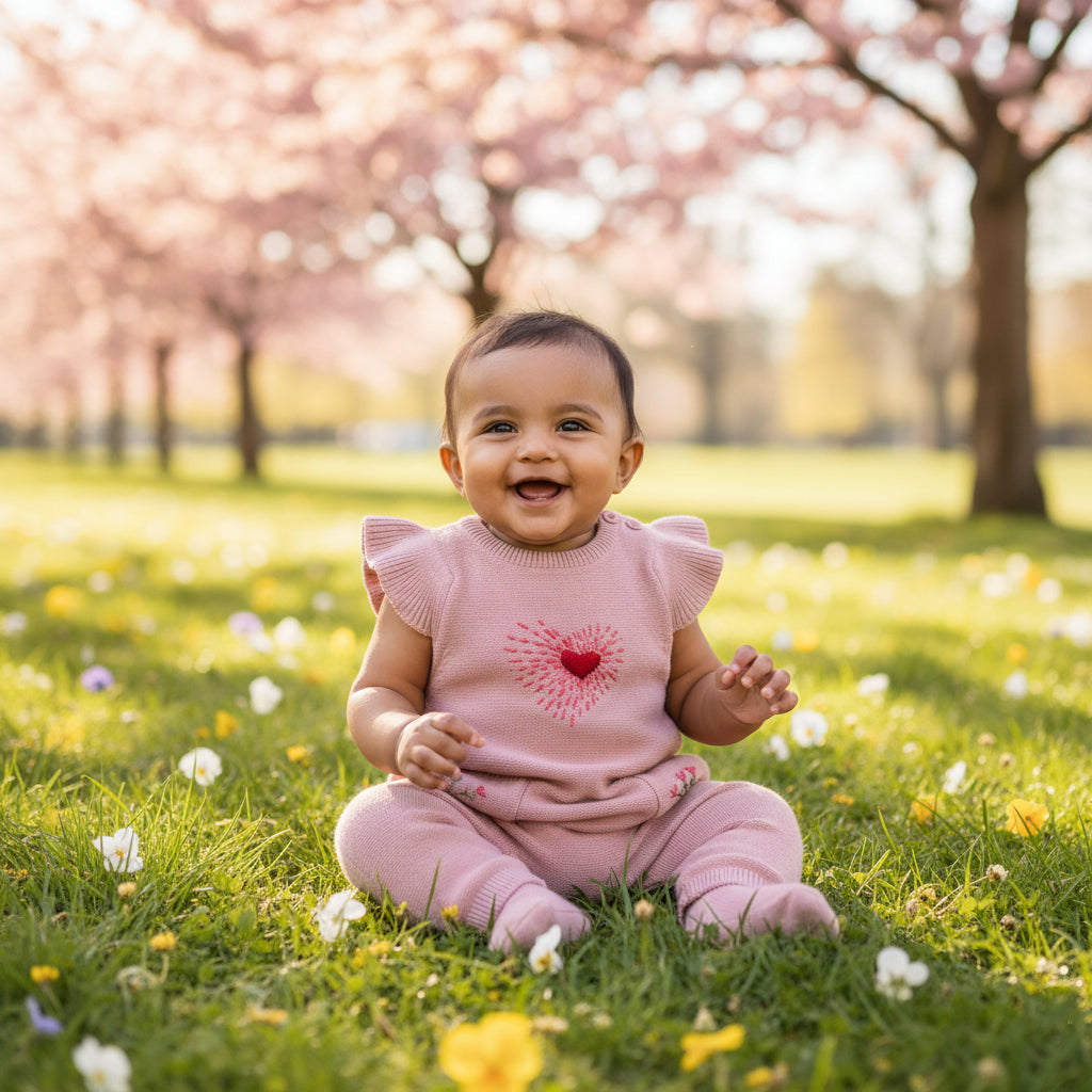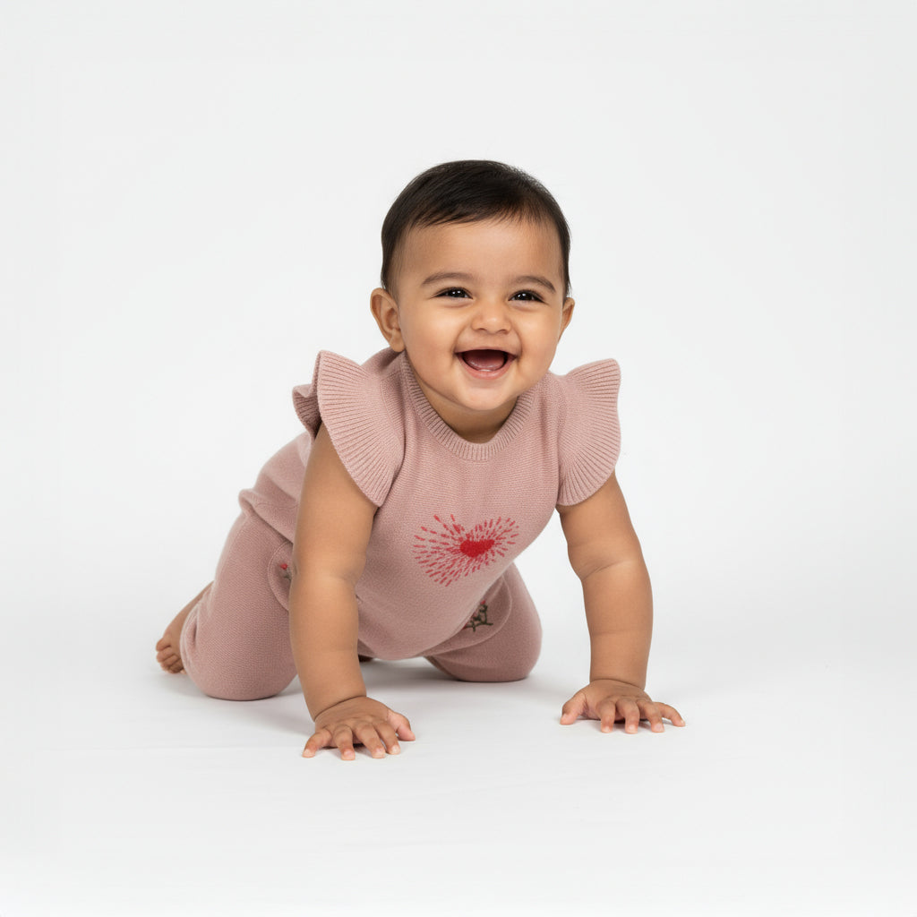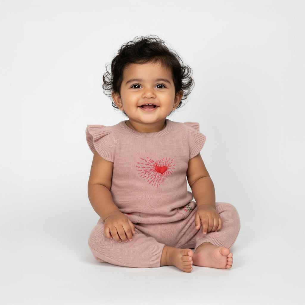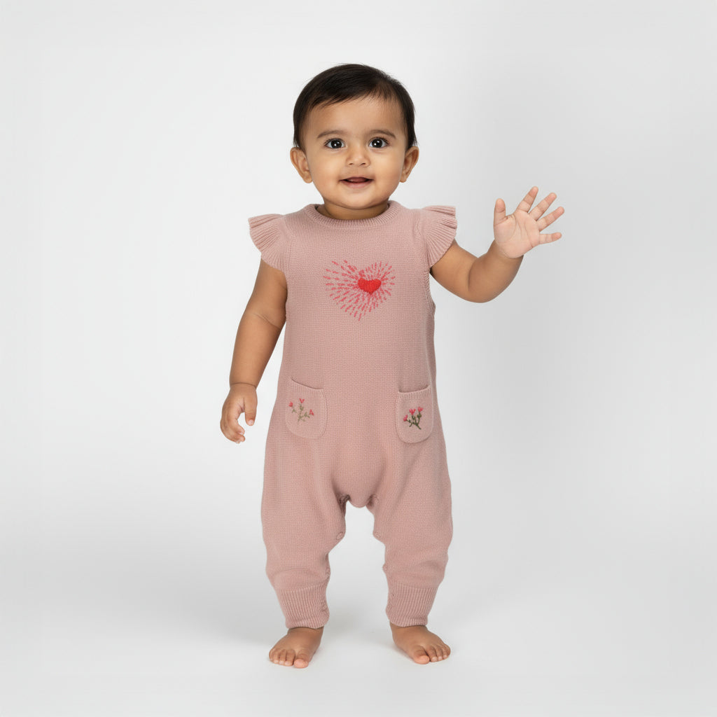 Dress your little one in comfort and cuteness with this beautifully designed knitted romper. Made from soft, baby-friendly fabric, this romper is gentle on delicate skin and perfect for everyday wear. The elegant flutter sleeves add a stylish touch, while the adorable heart embroidery on the chest enhances its charming look. Two small front pockets with floral detailing make this outfit even more attractive and functional.