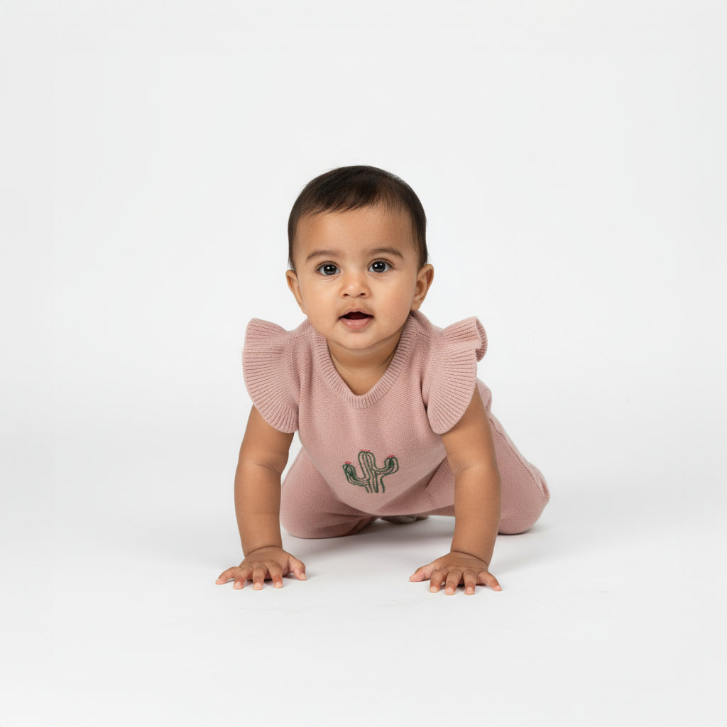 Add a fun and trendy touch to your baby’s wardrobe with this adorable pink knitted romper. Made from soft, breathable fabric, it keeps your little one comfortable throughout the day while being gentle on delicate skin. The cute cactus embroidery adds a playful and unique detail, while the flutter sleeves create a sweet and stylish look. Designed with two front pockets and a relaxed fit, this romper is perfect for everyday wear and special outings.