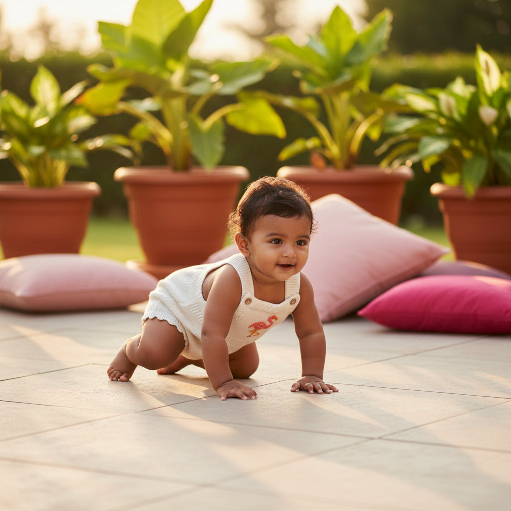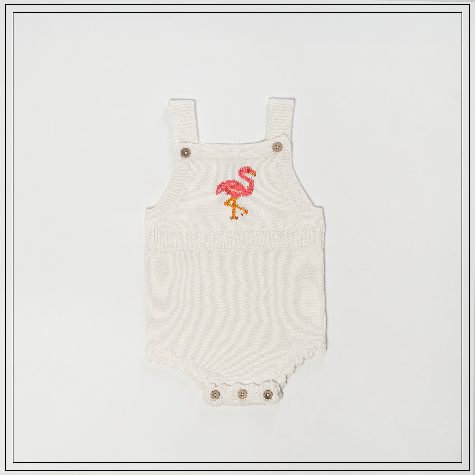 Bring playful charm to your baby’s wardrobe with this adorable knitted bodysuit. Made from soft, breathable knit fabric, it’s gentle on delicate skin and perfect for all-day comfort. The sleeveless design features adjustable shoulder straps with wooden buttons and easy snap-button closures at the bottom for quick diaper changes. Finished with a cute flamingo embroidery, this bodysuit adds a fun and stylish touch to everyday outfits.