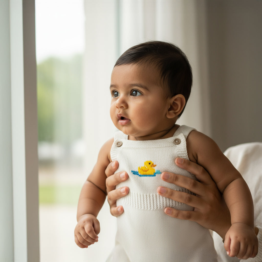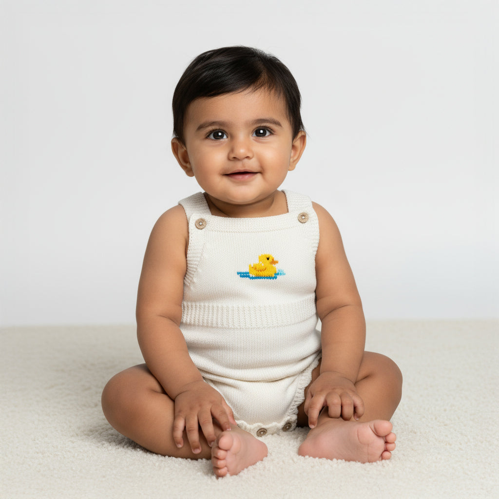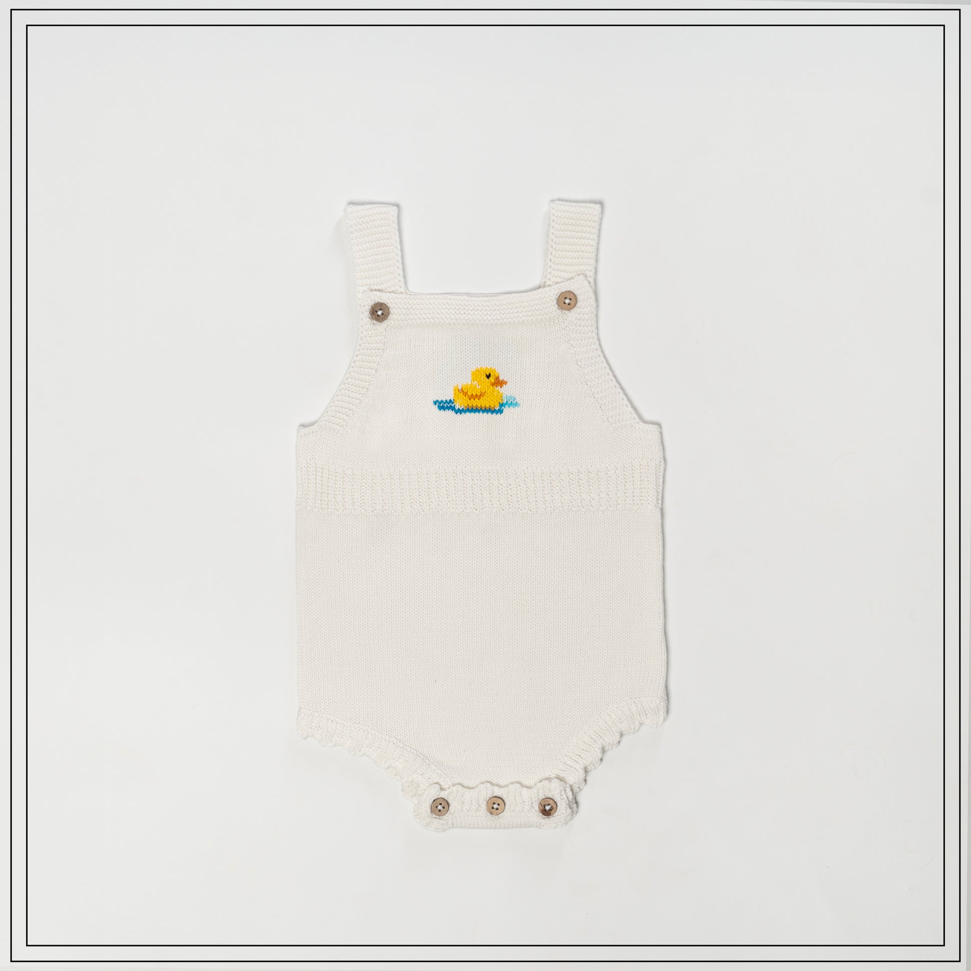 Keep your little one cozy and adorable with this charming knitted sleeveless romper. Crafted from soft and breathable baby-friendly fabric, this romper provides all-day comfort and gentle care for delicate skin. The cute duck embroidery on the front adds a playful and attractive touch, making it a perfect outfit for everyday wear and special moments.
