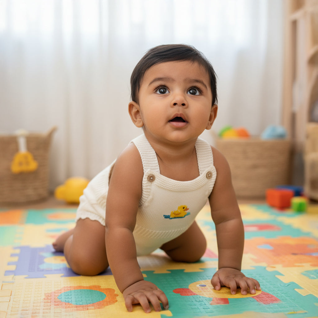 Designed with adjustable shoulder straps featuring wooden buttons, this romper ensures easy dressing and a secure fit. The bottom snap buttons allow quick and hassle-free diaper changes. The stretchable knitted material offers flexibility and comfort, allowing your baby to move freely.