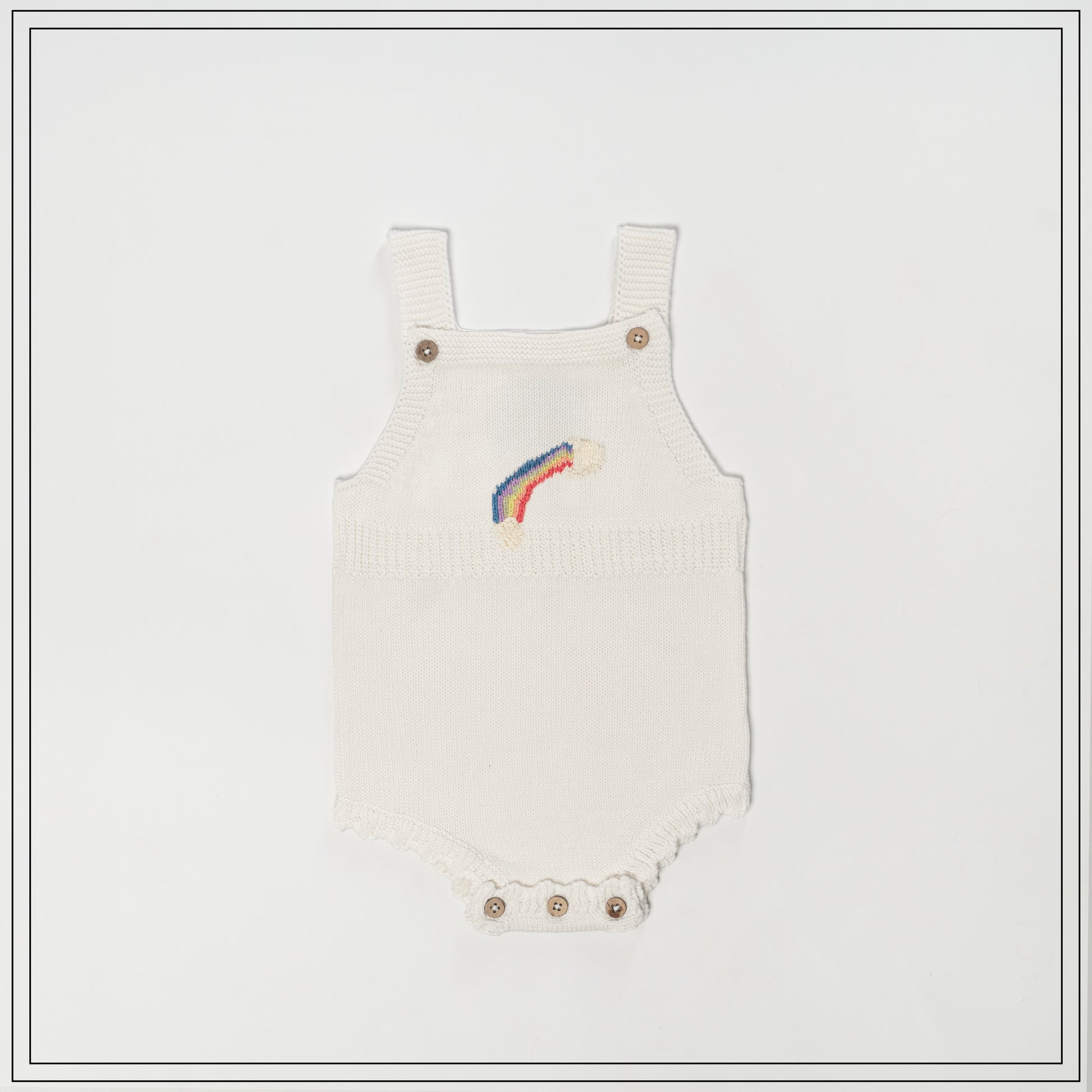 The front features a charming rainbow embroidery in soft pastel shades, adding a playful and cheerful touch to this classic design. Wooden buttons on the shoulder straps and snap-button closures at the bottom make dressing and diaper changes quick and convenient. The scalloped leg openings add an extra hint of sweetness to the overall look.