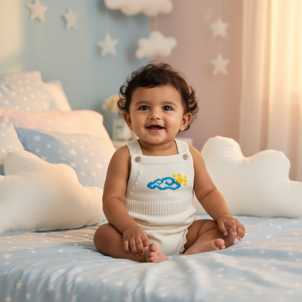 Keep your little one looking cute and feeling comfortable with this beautifully designed knitted romper. Made from soft and breathable baby-friendly fabric, this romper provides gentle care for delicate skin and ensures all-day comfort. The adorable cloud and sun embroidery on the front adds a playful and cheerful touch, making it perfect for everyday wear and special occasions.